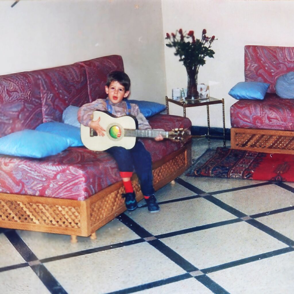 Un jour, j’ai ressorti ma vieille guitare acoustique en nylon. En jouant quelques arpèges, j’ai revu des souvenirs d’enfance. J’avais le souvenir d’une guitare similaire d’une guitare similaire et en fouillant dans les archives, j’ai retrouvé une photo où je tiens un instrument à 4 ans.